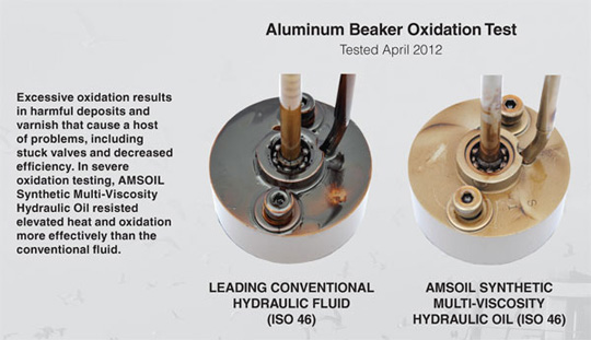 Multi-Viscosity Hydraulic Oil's naturally heat-resistant base oils resist thermal break-down and maintain their protective viscosity, allowing formation of a strong lubricating film for excellent wear protection. Because it doesn't contain the waxes inherent to conventional fluids, it flows more readily in cold temperatures, meaning bearings and other components receive almost immediate lubrication at start up, reducing long-term wear and instances of pressure spikes and erratic operation as a result of poor fluidity.